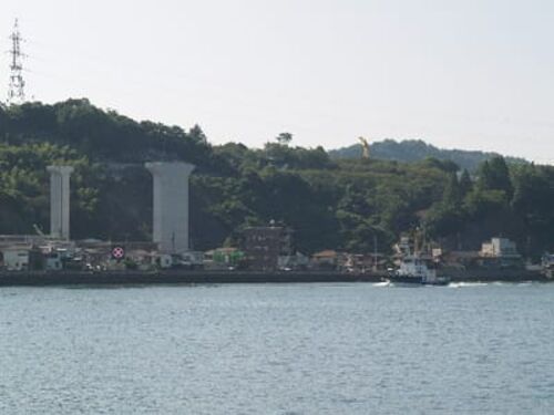 日新製鋼を左舷にみて音戸の瀬戸へ。 と、その前で停船。 ???と思っていたら、前方に×マークが。 対向してくる船を待っていたのであった。 建設中の第2音戸大橋の橋脚をみながら音戸の瀬戸を通過。 振り向けば、松山行きのフェリーが。 陸からは撮れない…